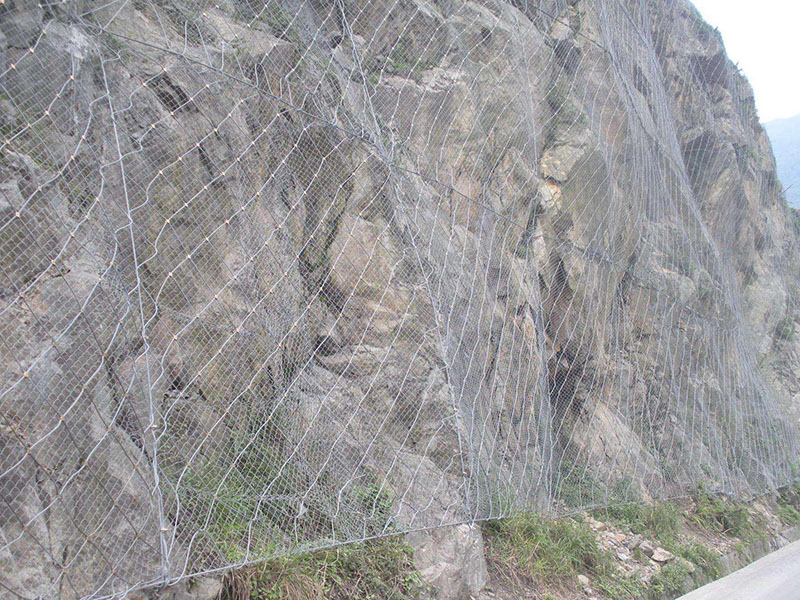 GAR2型主動防護網是采用Φ8的鋼絲繩(抗拉強度為1770Mpa,破斷拉力>40KN)編制并在結點處用專用“十字扣”固定而成,為邊坡防護網的主要特征構件之一,在主動防護中通過鋼絲繩網的覆蓋來實現邊坡的加固,其開放特征可以實現對坡面天然植被和植被生長條件的最佳保護,實現環境保護與災害治理的有機結合;在被動防護系統中,其柔性特征充分體現了“以柔克剛”的思想,實現崩塌落石的有效攔截。